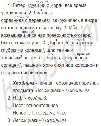 1. Ветер дувший с моря всё время усиливался. 2. Листва сорванная с деревьев закружилась в вихре и стала подниматься кверху. 3. Мыс возвышавшийся над поверхностью озера был похож на утюг. 4. Дорога вся изрытая глубокими колеями шла тёмным хвойным3 лесом. 5. Остров озарённый солнцем пышно и ярко сиял над холодной и неприветливой водой.4