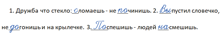 Прочитайте. Вставьте в слова пословиц пропущенные приставки.