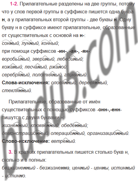 1. Изучите запись и сделайте вывод, почему прилагательные разделены на две группы. В каких из них суффиксы имеют одну букву н, а в каких — две?