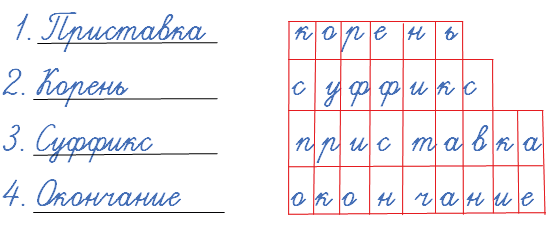 Впишите в клеточки слова-названия четырёх значимых частей слова. На свободных строках запишите эти названия в порядке их расположения в слове.
