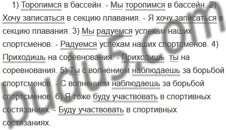 1) Торопимся в бассейн. 2) Хочу записаться в секцию плавания. 3) Мы радуемся успехам наших спортсменов. 4) Приходишь на соревнования. 5) Ты с волнением наблюдаешь за борьбой спортсменов. 6) Я тоже буду участвовать в спортивных состязаниях.