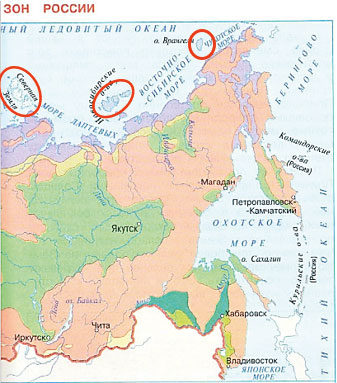 Зона арктических пустынь занимает острова Арктики, или их некоторую часть. На карте они обозначены очень серо – голубым цветом.
