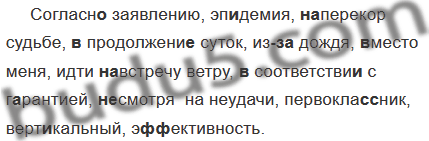 Согласн.. заявлению, эп..демия, (на)перекор судьбе, (в)продолжении суток, из(за) дождя, (в)место меня, идти (на)встречу ветру, (в)соответстви.. с гар..нтией, (не)смотря на на (не)удачи, первокла(с,сс)ник, верт..кальный, э(ф,фф)ективность.