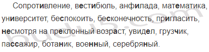 Сопрот..вление, в..ст..бюль, анф..лада, мат..матика, ун..верситет, бе(з, с)покоить, бе(з, с)конечность, пр..гласить, (не)смотря на пр..клонный возр..ст, увид..л, груз..ик, па(с, сс)ажир, бота(н, нн)ик, вое(н, нн)ый, серебря(н, нн)ый.