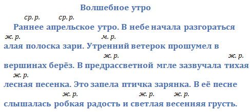 Ранн... апрельск... утро. В небе начала разгораться ал... полоска зари3. Утренн... в..т..рок пр..шумел в в..рш..нах берёз. В пр..драссветной мгле з..звучала тих... лесн... песенка. Это з..пела птичка зарянка. В её песне слышалась робк... радость и светл... весенн... грусть.