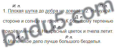 1. Плохая шутка до добра не доведёт.4 2. На чужой стороне и солнце не греет. 3. К большому терпенью придёт уменье. 4. На красный цветок и пчела летит. 5. Маленькое дело лучше большого безделья.